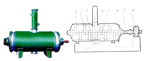 具有結(jié)構(gòu)簡單,操作方便,使用周期長,性能穩(wěn)定可靠,蒸汽耗量小,適用性能強(qiáng),產(chǎn)品質(zhì)量好,特別適用于不耐高溫、易燃、調(diào)溫下易氧化的膏狀物料的干燥,該機(jī)經(jīng)用戶長期使用證明是一良好的干燥設(shè)備。原理:被干燥物料從殼體上方正中間加入,在不斷正反轉(zhuǎn)動(dòng)的耙齒的攪拌下,物料軸向來回走動(dòng),與殼體內(nèi)壁接觸的表面不斷更新,受到蒸汽的間接加熱,耙齒的均勻攪拌,粉碎棒的粉碎,使物料表面水分更有利的排出,氣化的水分經(jīng)干式除塵器、濕式除塵器、冷凝器,從真空泵出口處放空。結(jié)構(gòu):真空耙式干燥機(jī)的主要部件。